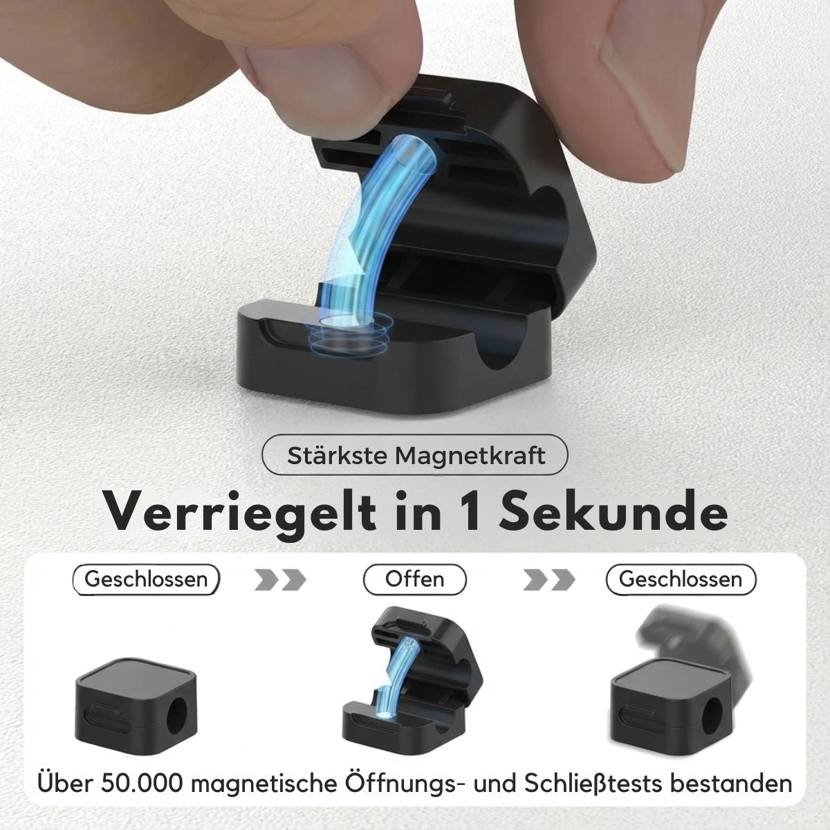 Der innovative Magnetverschluss ermöglicht eine komfortable Einhandbedienung: Kabel lassen sich mühelos entnehmen und schnappen magnetisch zurück in ihre Position. Kein Verrutschen, kein Suchen am Boden.