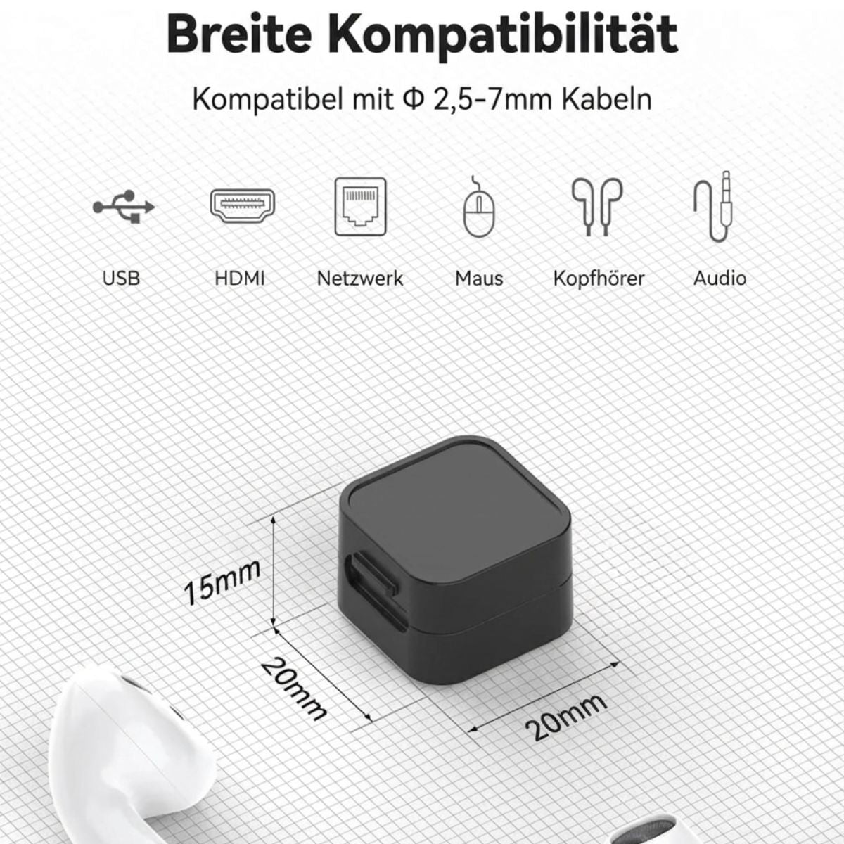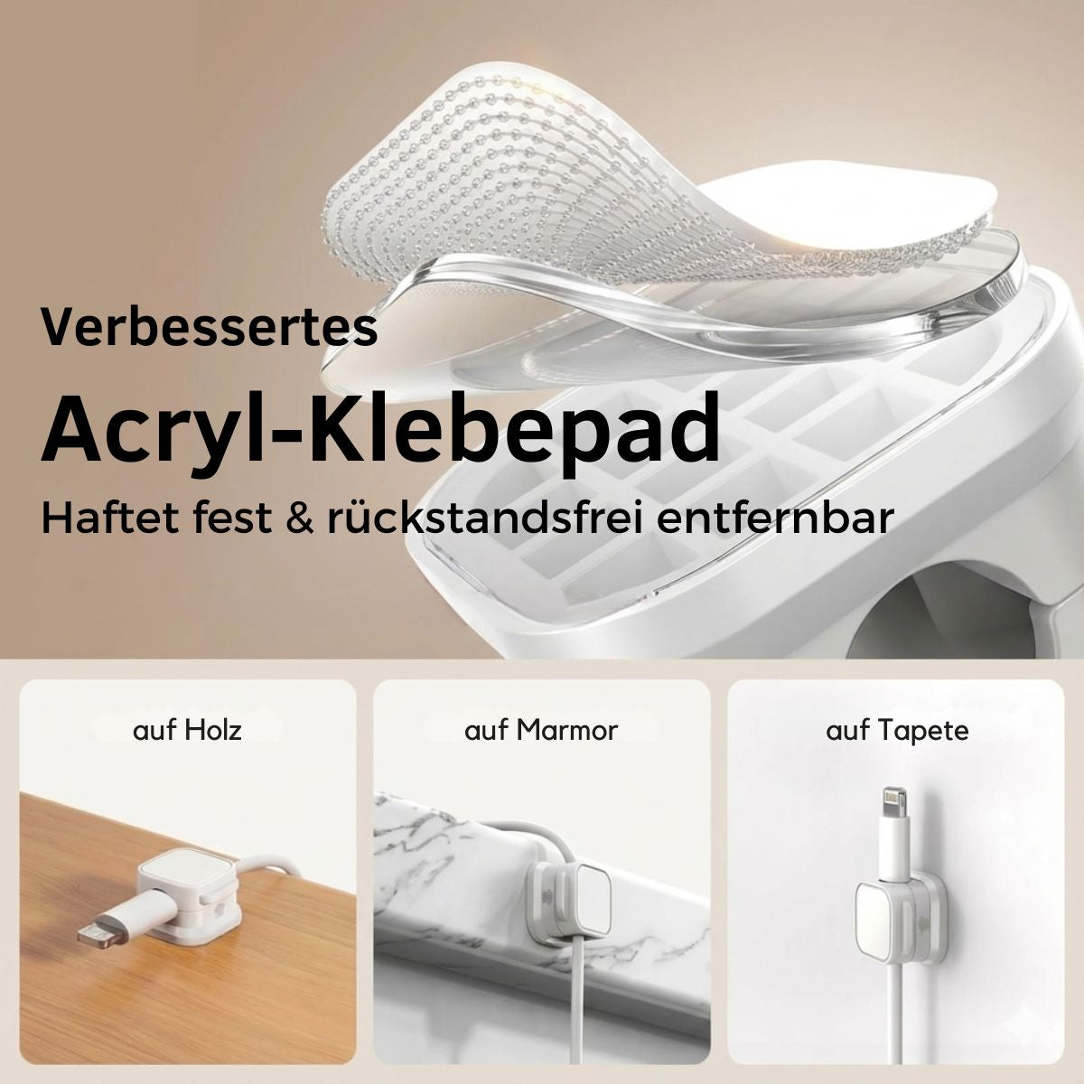 Dank des verbesserten Acryl-Klebers haften die Clips sicher auf Holz, Glas, Metall oder im Auto – und lassen sich bei Bedarf absolut rückstandsfrei entfernen. Mit einem Durchmesser von 7mm perfekt geeignet für iPhone-, USB-C- und HDMI-Kabel.